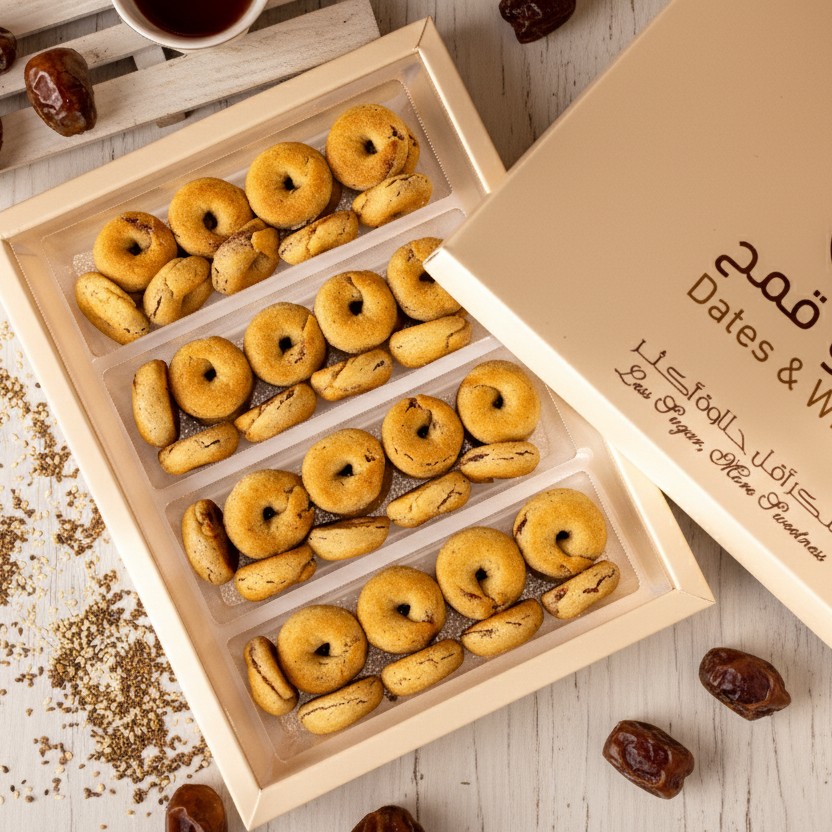 حلقات تمر صغيرة تؤكل بلقمة واحدة، مصنوعة من عجينة السميد المنكّهة بالشومر واليانسون، تعبق برائحة التراث وطعم لا يُقاوم.حلقات تمر صغيرة تؤكل بلقمة واحدة، مصنوعة من عجينة السميد المنكّهة بالشومر واليانسون، تعبق برائحة التراث وطعم لا يُقاوم.