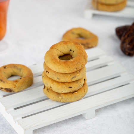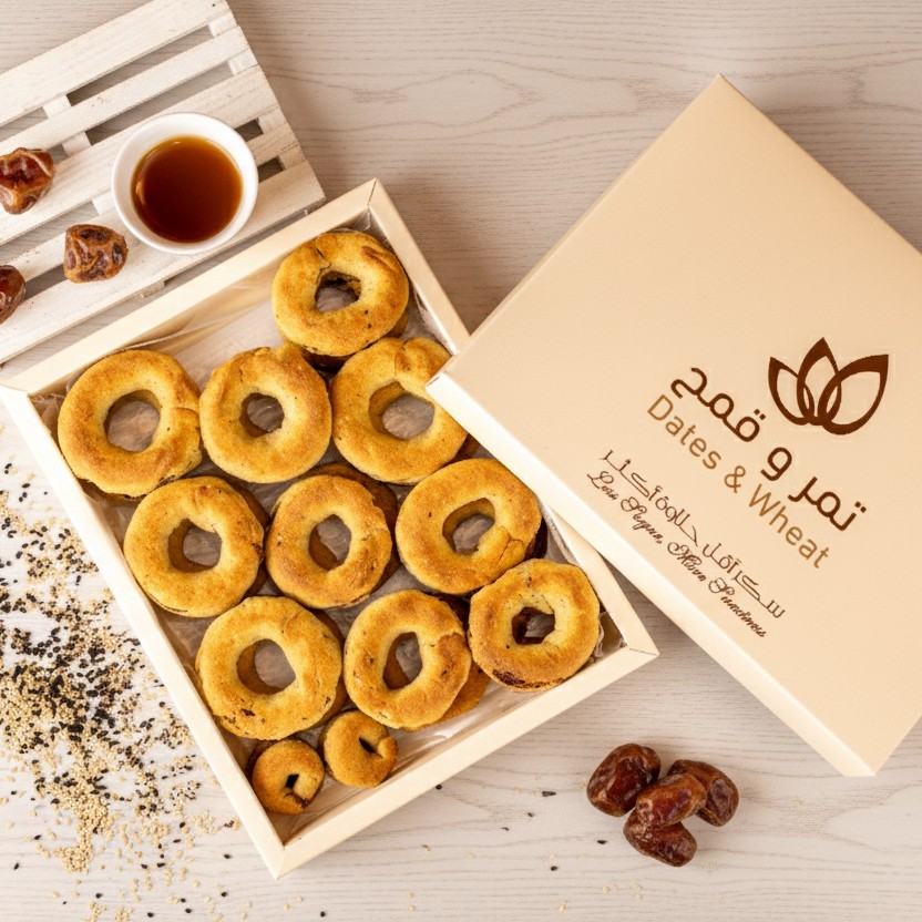 Palestinian Ka’ak from Dates and Wheat – also known as “Asawer,” made from wheat flour, filled with rich date paste, and coated with a traditional blend of sesame seeds, nigella seeds, fennel, and anise. A 100% authentic recipe that captures the aroma of festive mornings and the warmth of heritage in every bite.