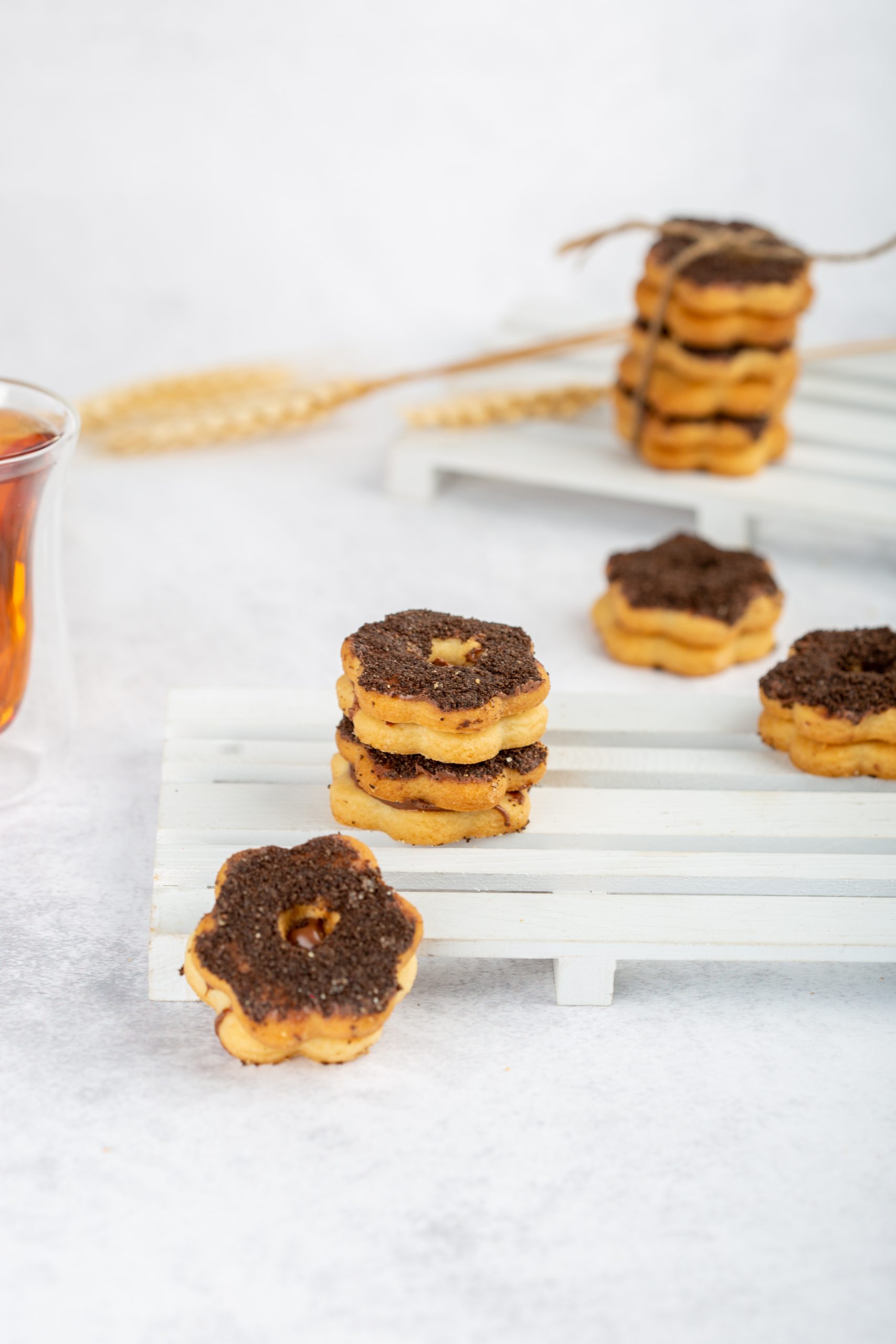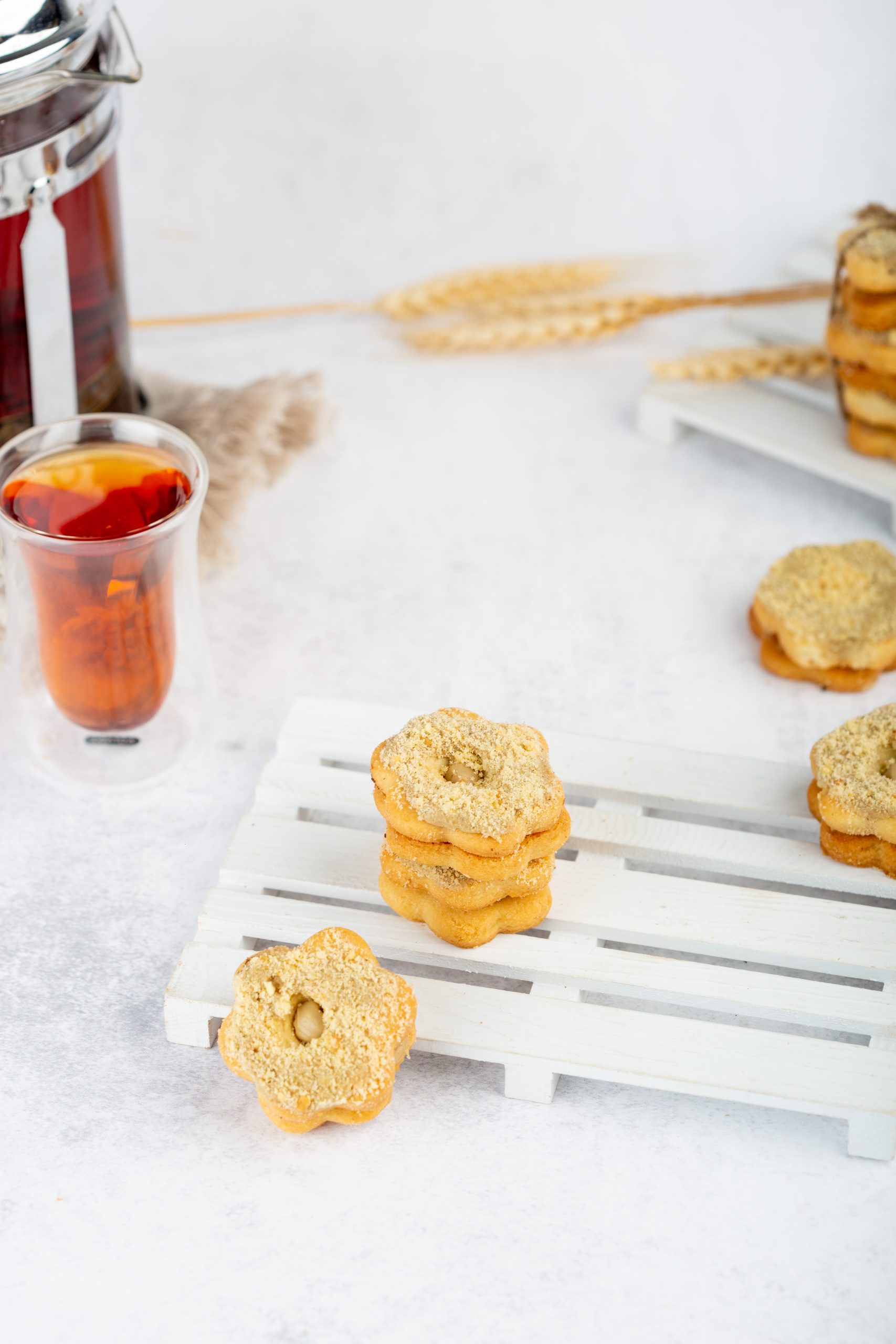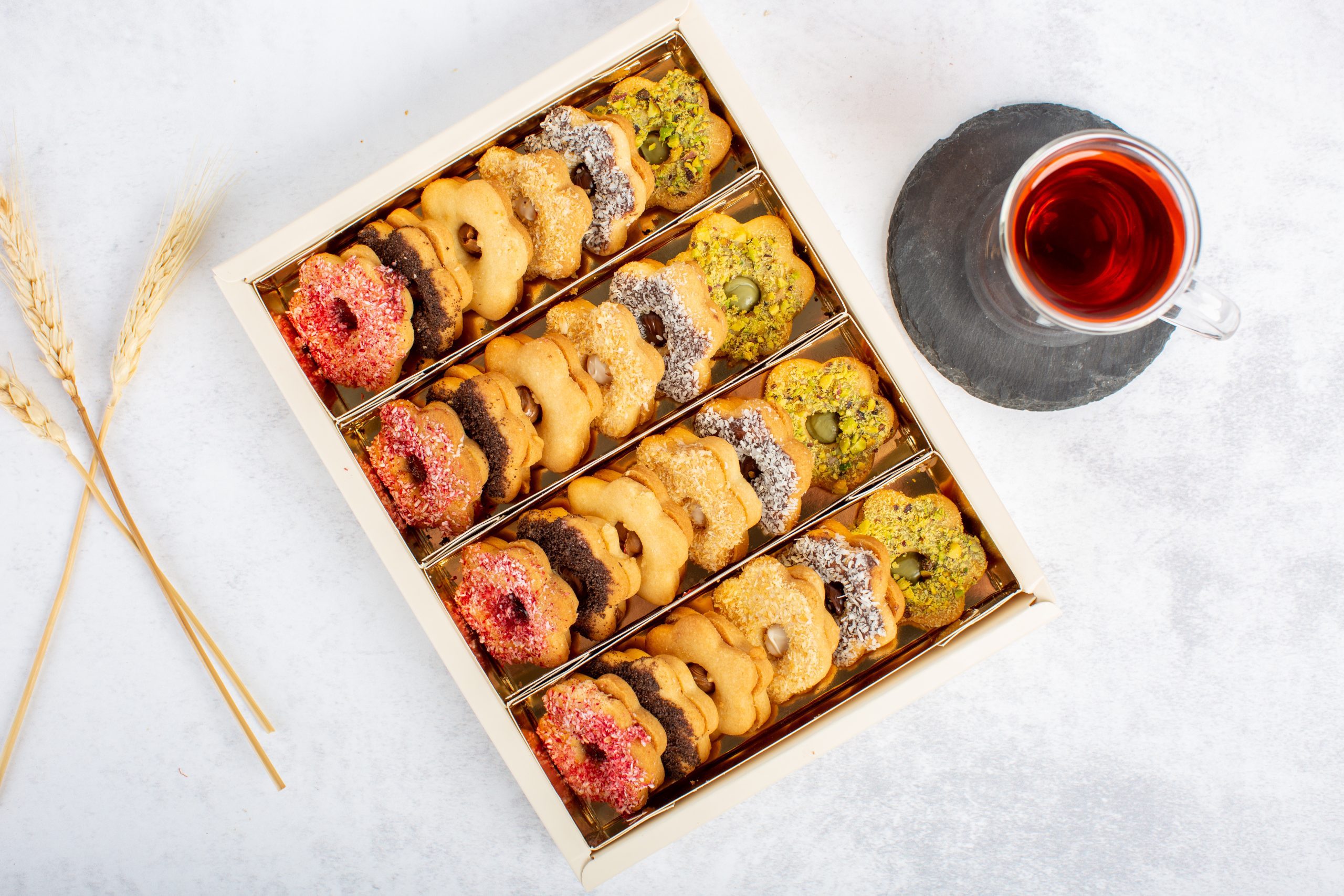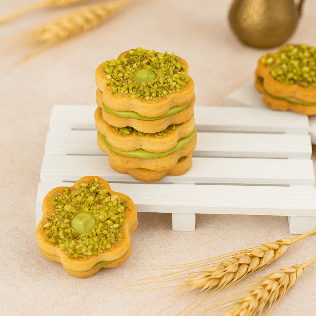 Sablé from Dates and Wheat—each bite is a unique story with a different flavor. It is filled with jam, pistachio cream, rehash cream, coffee cream, chocolate, hazelnut chocolate, and more carefully selected fillings. Made from wheat flour and the spirit of Dates and Wheat, it delivers little moments of joy in every piece, like tasting a celebration, one bite at a time.